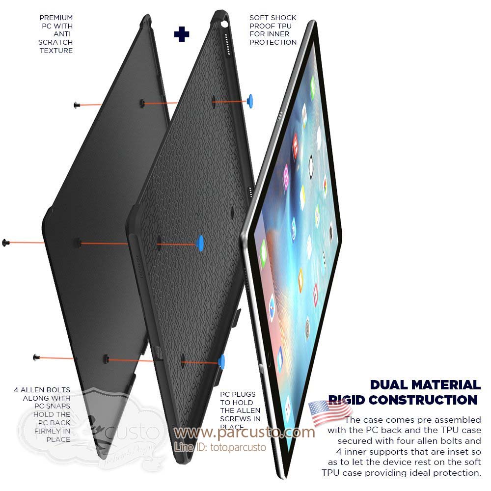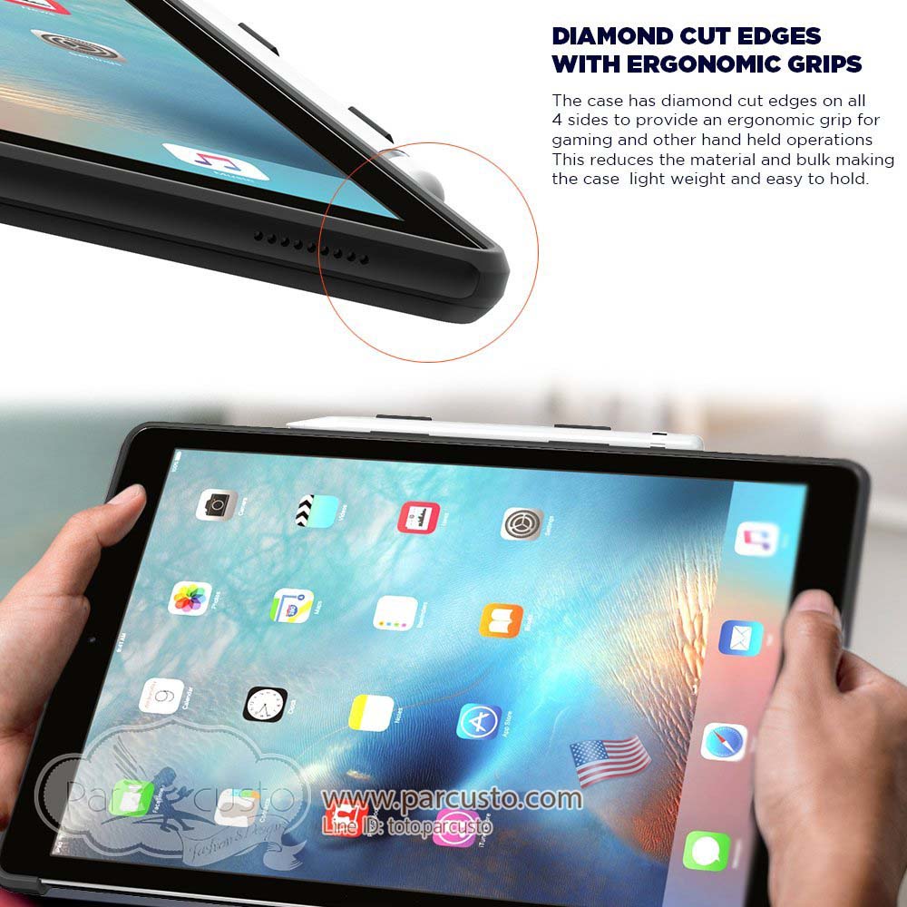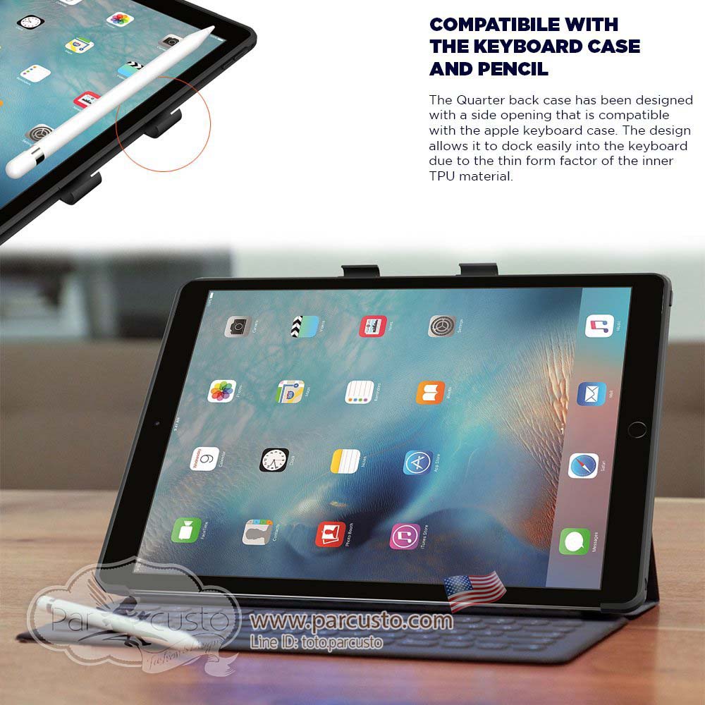 The quarterback is a simple case that is made up of a PC back along with shock absorbing TPU on the inside that forms the perfect blend of style and protection. Being a large device the tablet automatically needs both hands to secure it, but with our diamond cut edges it provides a natural resting position for your hand. The TPU is also textured to provide a good grip while using the case. The buttons are raised and are tested to provide a good tactile feel while clicking the buttons. The PC back while providing impact and scratch protection is also designed to have a great mix of colors which will suit your passion whether its sports or fashion. To compliment the tablets and understanding that adding extra bulk will make it heavier, we have designed the case to be as thin as possible while accommodating all these features. We also appreciate the fact that the case will be used in conjunction with the apple keyboard and pencil and have created the case to be compatible with both. The case is truly a leader in its own category and is a touch down for your device protection.